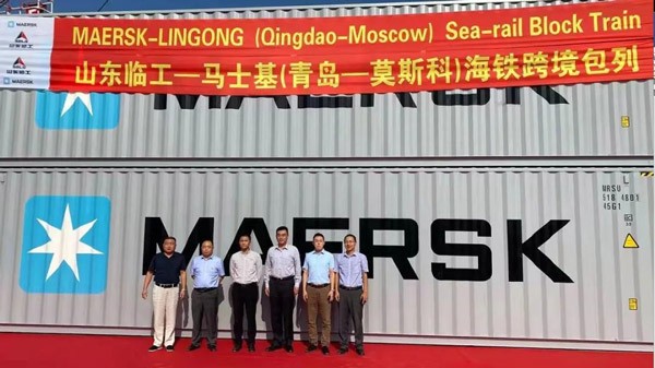 山东350vip8888新葡的京集团-马士基(青岛-莫斯科)海铁跨境包列 启运仪式成功举行