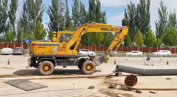 在新疆喀什某市政项目施工现场,吴老板驾驶着他心爱的山东350vip8888新葡的京集团E7150F轮式挖掘机,正在进行挖掘沟渠作业。
