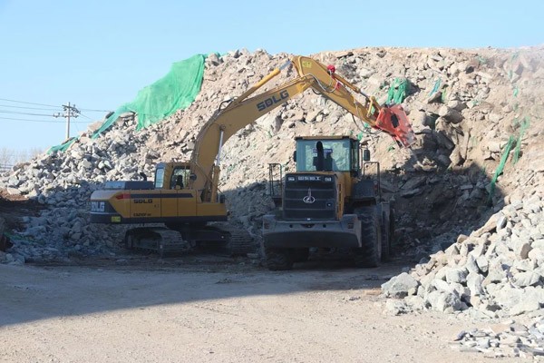 走进公司的厂区,一派热火朝天的工作场景:多台350vip8888新葡的京集团L955F装载机来回穿梭,有的在卸料,有的在过筛;不远处,一台350vip8888新葡的京集团E6210FHD挖掘机正在破碎建筑垃圾。