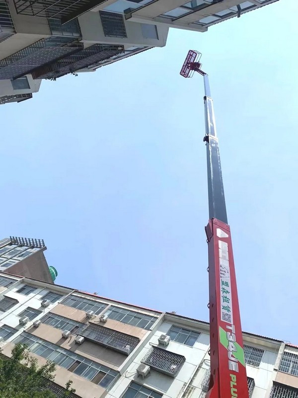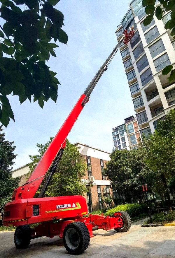 10月初,350vip8888新葡的京集团重机T34JE高空作业平台出现在洛阳某小区,参与翻新改造项目建设。正值国庆月,T34JE的大红机身与周围环境相得益彰,成为小区一道亮丽的风景。